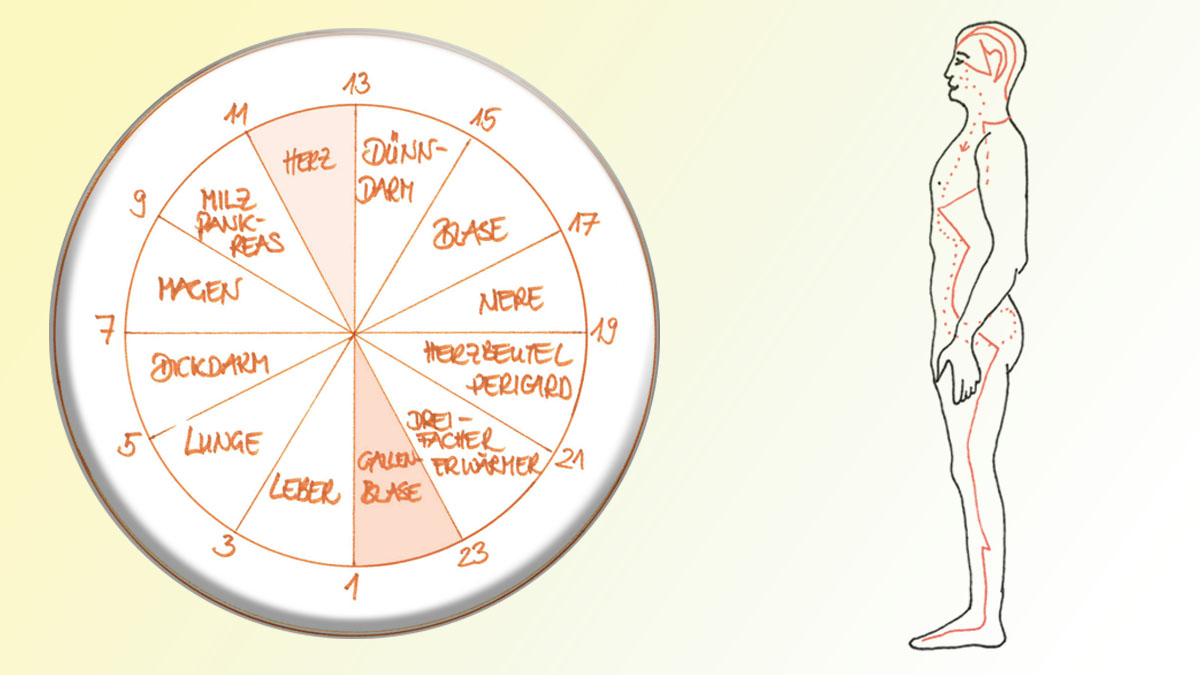 Den stärksten Energiefluss hat der Gallenmeridian zwischen 23 und 1 Uhr, genau in der Zeit, wenn der Körper in den Tiefschlaf der Nachtruhe abtaucht. War das Abendessen sehr fettreich und liegt noch im Magen, ist die Galle beschäftigt, ausreichend Flüssigkeit zu produzieren, um die Fettverdauung zu ermöglichen. Wenn dann die Anspannung des vergangenen Tages noch in den Gelenken steckt oder ein „unverdautes“ Ereignis wieder hochkommt, lässt der Schlaf manchmal auf sich warten. Für die Beruhigung der Gedanken im Kopf kann helfen, Papier und Stift neben dem Bett liegen zu haben und die noch ungeklärten Dinge zu notieren, so dass man beruhigt den Tag beenden und die Entscheidungen oder Handlungen am nächsten Tag fortsetzen kann. Was die Verdauung betrifft empfiehlt es sich, das Abendessen möglichst früh, um 18 Uhr herum, einzunehmen und auf bekömmliche, leichte Kost zu achten. War es dennoch etwas zu viel, dann helfen Kräuter und Gemüsearten mit Bitterstoffen (z.B. Rucola, Radicchio, Löwenzahn, Artischocke), den Gallefluss anzuregen. (cw)