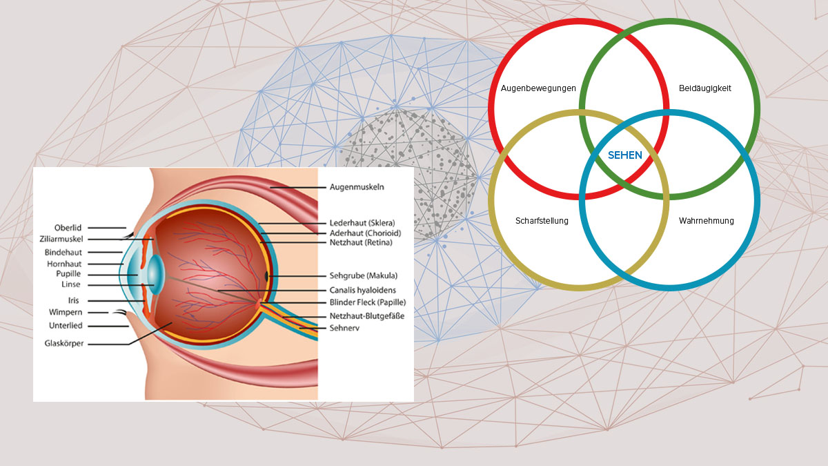 Die Augen funktionieren dabei wie eine Kamera. Ähnlich einem Objektiv fällt Licht durch die einzelnen Bauteile des Auges. Die Hornhaut als Vorwölbung des Augapfels und die Linse in der vorderen Augenkammer sammeln und bündeln die Lichtstrahlen. Die davor liegende Regenbogenhaut mit der Pupille reguliert wie eine Blende das einfallende Licht, die lichtempfindlichen Zellen auf der Netzhaut wandeln den physikalischen Reiz in Nervenimpulse um. Das räumliche Sehen entsteht erst im Gehirn durch die Kombination der Informationen beider Augen. Pro Sekunde nehmen die Augen 10 Millionen Informationen auf und geben sie an das Gehirn weiter, das sämtliche Bilder vergleicht mit den im Laufe des Lebens gesammelten Objekten und Gefühlseindrücken.