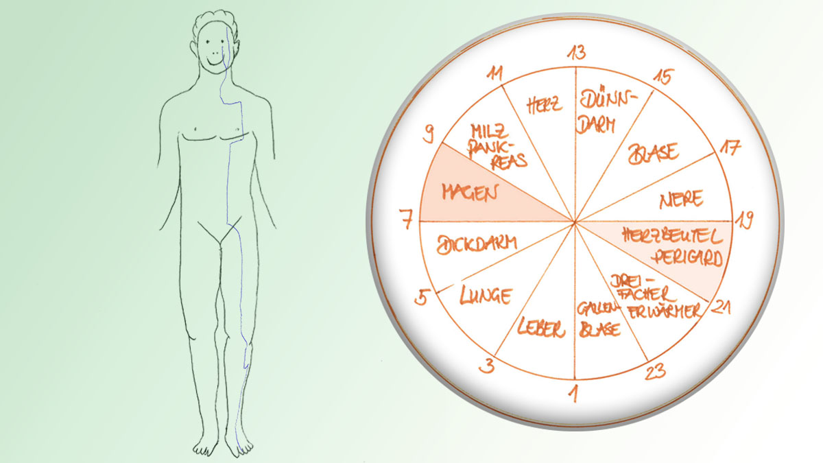 Der Energiefluss verläuft im Magen-Meridian an der Körpervorderseite vom Himmel zur Erde. Die Verdauung sowohl auf physischer Ebene als auch hinsichtlich Seelisch-Geistigem zählt zu den Aufgaben des Magen-Meridians. Eine Unausgeglichenheit – z. B. durch zu viel Stress oder Überinformation – nimmt Einfluss auf die emotionale Befindlichkeit; man bekommt eine Magenverstimmung.