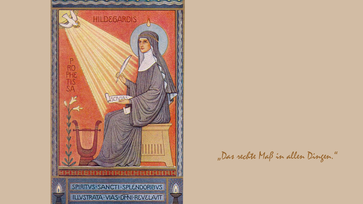 Sie war höchst modern. Oder müssen wir heute wieder „modern“ werden? Jedenfalls mussten wir „modernen“ Menschen den Glauben an ganzheitliche Heilung erst wieder neu entdecken. Für Hildegard von Bingen war es damals schon ganz klar: Körper, Geist und Seele sind eine untrennbare Verbindung und beeinflussen sich gegenseitig. „Leib und Seele sollen eine gute Ehe miteinander führen.“ Sie beschäftigte sich bereits im Mittelalter damit, dass der Geist, der bis in die inneren Organe wirke, gereinigt und immer wieder befreit werden müsse. Hinter all dem steht für Hildegard von Bingen die Kraft Gottes, die die eigentliche Heilung bewirkt. Heute würde man es „Meditation“, „ganzheitlich heilen“, „Psychosomatik“, „Gedankenheilen“, „die Kraft des positiven Denkens“, „Balanciertes Leben“, „Gesund durch gute Ernährung“ und „Heilung durch die Kraft der Natur“ nennen.