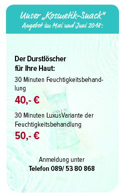 Damit Sie den Weg leichter zu uns finden, haben wir unseren „Kosmetik-Snack“ für Sie entwickelt, eine Kurzbehandlung, die Ihrer Haut intensiv Feuchtigkeit schenkt. Nachdem wir mit unserem Stick den Feuchtigkeitsgehalt gemessen haben, wird das Gesicht gereinigt, mit dem neuen Hydra Essence gepflegt, und natürlich bekommen Sie auch eine Feuchtigkeitsmaske. Nach 30 Minuten verlassen Sie erfrischt unser Studio.