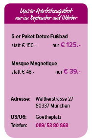 Entsprechend unserem Motto „gesund und schön“ empfehlen wir im Herbst unsere Entgiftungskur mit dem Elektrolysefußbad 4-balance. Es nutzt das Wasser als großflächige Elektrode und hilft dem Körper, sich von Stoffwechselabfall zu befreien. Eine Kur von 5 Anwendungen zeitnah hintereinander ist sinnvoll und führt zu einer generellen Verbesserung des Wohlbefindens.