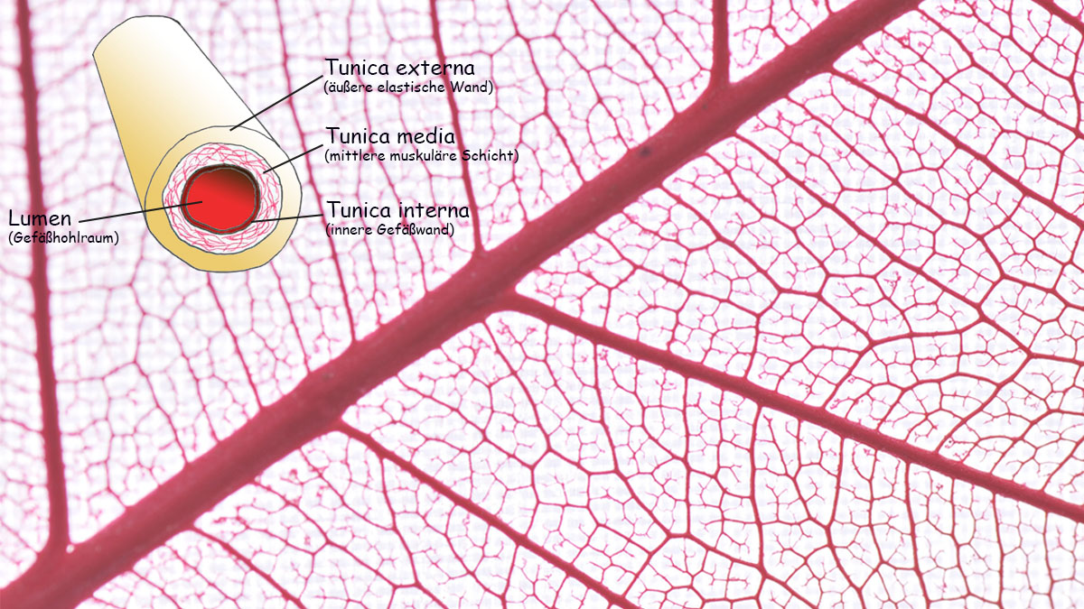 Damit dieses sauerstoffreiche Blut überall jede einzelne Körperzelle erreichen und versorgen kann, müssen Arterien intakt, elastisch und frei sein. Die arteriellen Gefäße bestehen aus drei Schichten: einer inneren Gefäßwand, einer mittleren muskulären Schicht und einer äußeren elastischen Wand (siehe Abb. 2)*. Dieser Aufbau ermöglicht einen gleichmäßigen Blutstrom. Krankhafte Gefäßveränderungen wie Entzündungen oder Arteriosklerose betreffen zumeist die mittlere Schicht. In der Folge kommt es zu Verengungen und Versteifungen der Gefäße, der Blutfluss ist behindert.